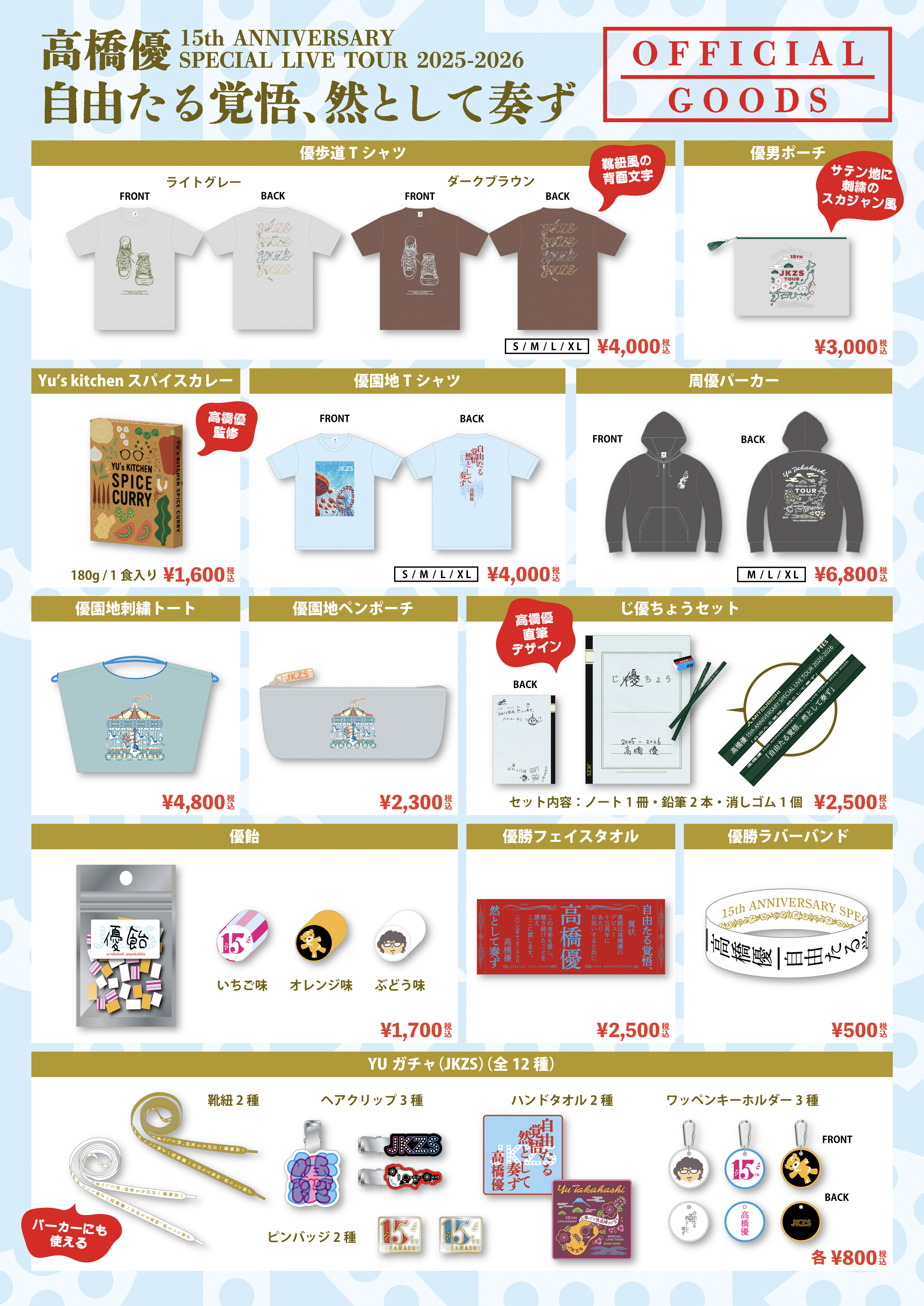 高橋優 15th ANNIVERSARY SPECIAL LIVE TOUR 2025-2026「自由たる覚悟、然として奏ず」のオフィシャルグッズ追加アイテムを4月11日(土)群馬・高崎芸術劇場公演より販売開始いたします。